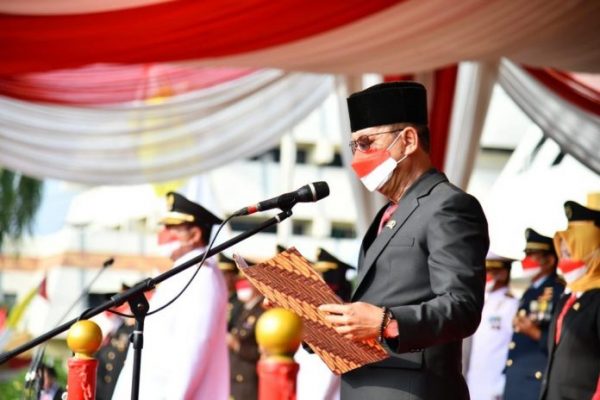 BANDARLAMPUNG, – Ketua DPRD Provinsi Lampung melakukan pembacaan teks Proklamasi dalam rangka memperingati HUT RI ke 77 dengan tema Pulih Lebih Cepat Bangkit Lebih Kuat di Lapangan Korpri Telukbetung, Rabu (17/8/2022)