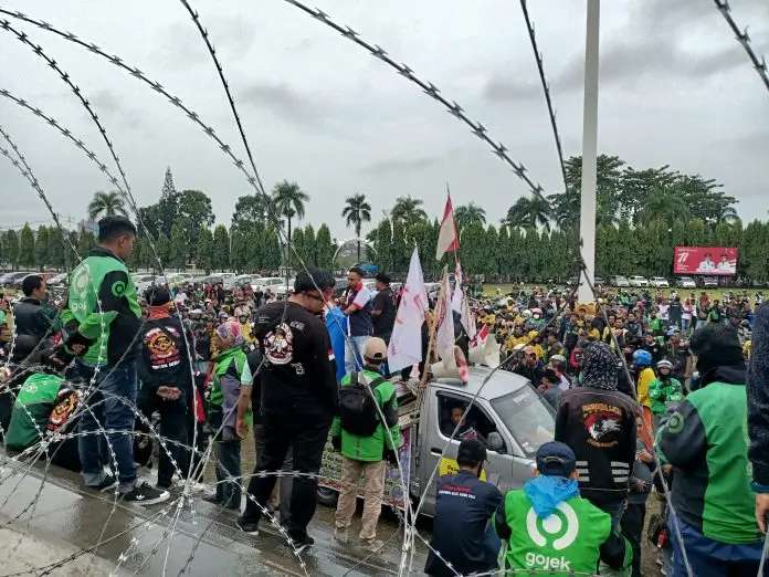 BANDARLAMPUNG, – Aksi ratusan Ojek Online (Ojol) demo datangi kantor DPRD Lampung terkait kenaikan harga BBM di lapangan korpri, Kamis (08/09/22).