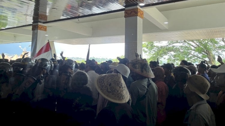 Mereka yang lelah menunggu sejak pagi, naik ke lantai 2 dan menggedor kaca DPRD Lampung.Massa mulai sedikit tenang setelah Ketua DPRD Lampung Ahmad Giri Akbar yang ikut rapat bersama petani, menemui massa petani di luar.