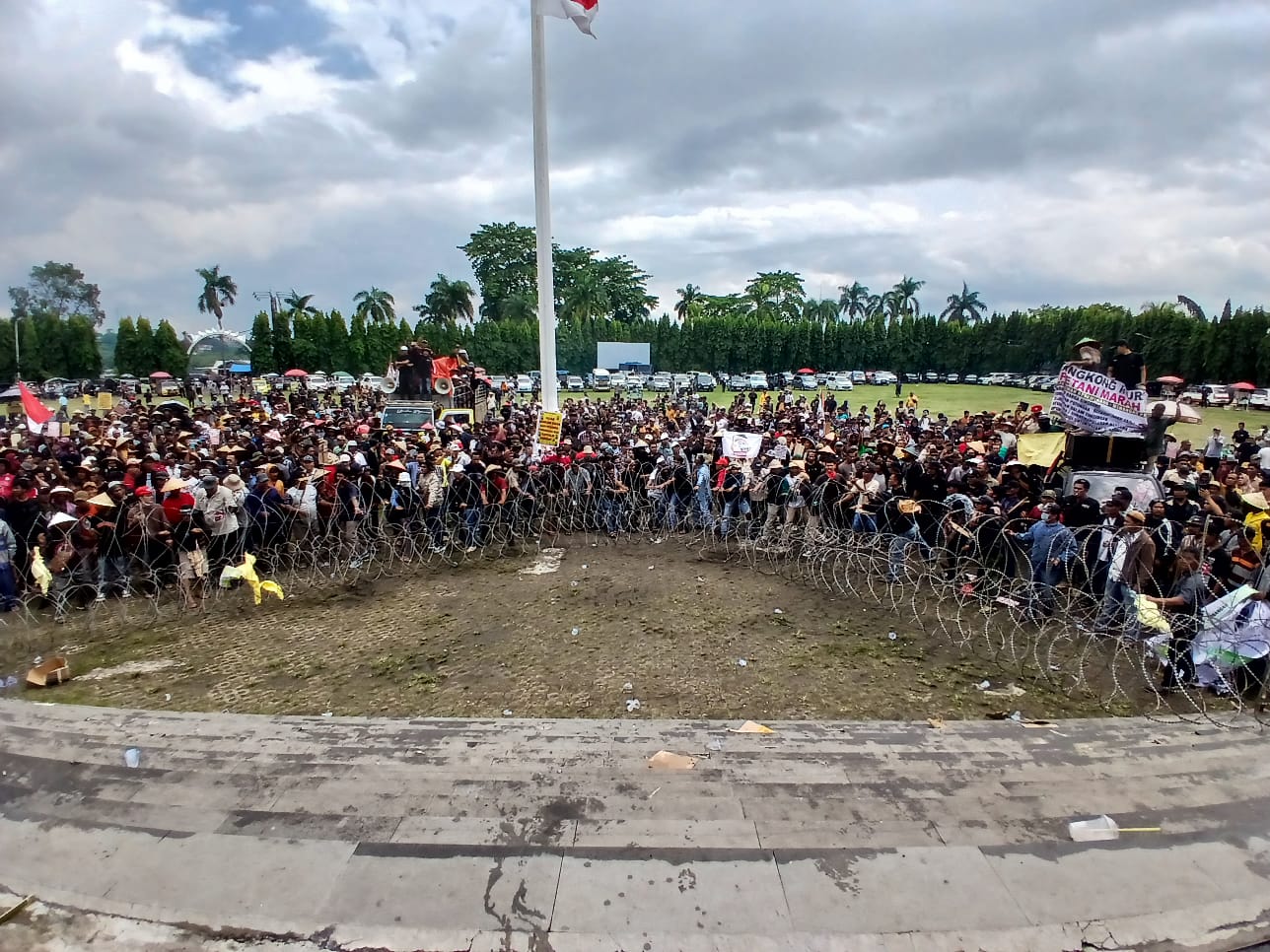 Namun, hingga siang hari, baik Pj Gubernur maupun perwakilan pemerintah belum muncul. Hal ini memicu kemarahan massa, yang mulai menarik-narik kawat berduri yang dipasang sebagai pembatas di depan kantor gubernur.