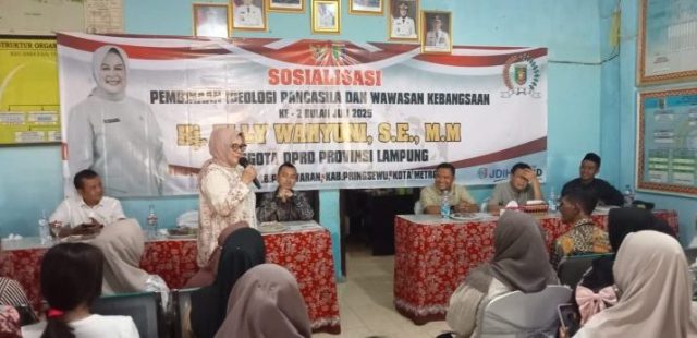 Anggota DPRD Provinsi Lampung Elly Wahyuni melaksanakan sosialisasi Pembinaan Ideologi Pancasila dan Wawasan Kebangsaan di Desa Gebang dan Desa Batu Menyan, Kecamatan Teluk Pandan, Pesawaran, Sabtu (5/7/2025).