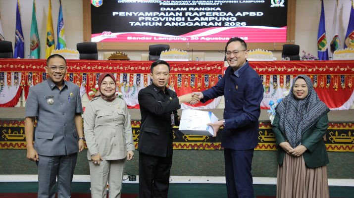 Pemerintah Provinsi (Pemprov) Lampung menyerahkan dokumen Rancangan Peraturan Daerah (Raperda) Anggaran Pendapatan dan Belanja Daerah (APBD) Tahun Anggaran 2026 kepada DPRD Provinsi Lampung.